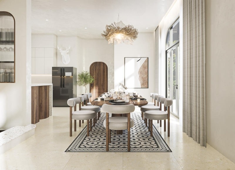 Ekip kiến trúc sư đã sử dụng màu gỗ làm điểm nhấn vừa cân bằng không gian vừa tạo nên một bầu không khí ấm cúng. Ứng dụng hiệu quả các đường bo cong tinh tế trong từng chi tiết tường, cửa và các sản phẩm nội thất. Việt liệu được sử dụng từ thiên nhiên thân thiện với môi trường. Tuy ít chi tiết trang trí nhưng mỗi sản phẩm đều được trau chuốt tinh xảo và đạt đến chất lượng hoàn hảo.